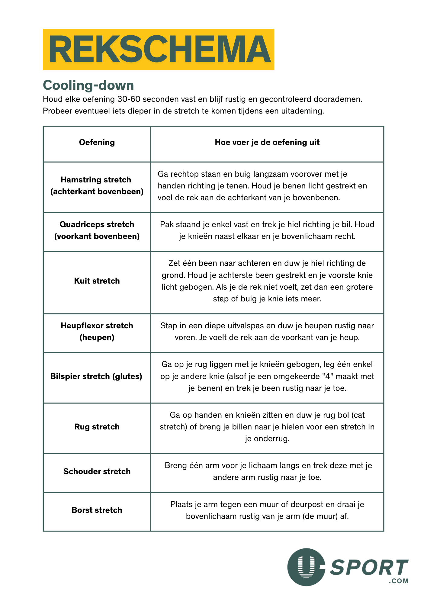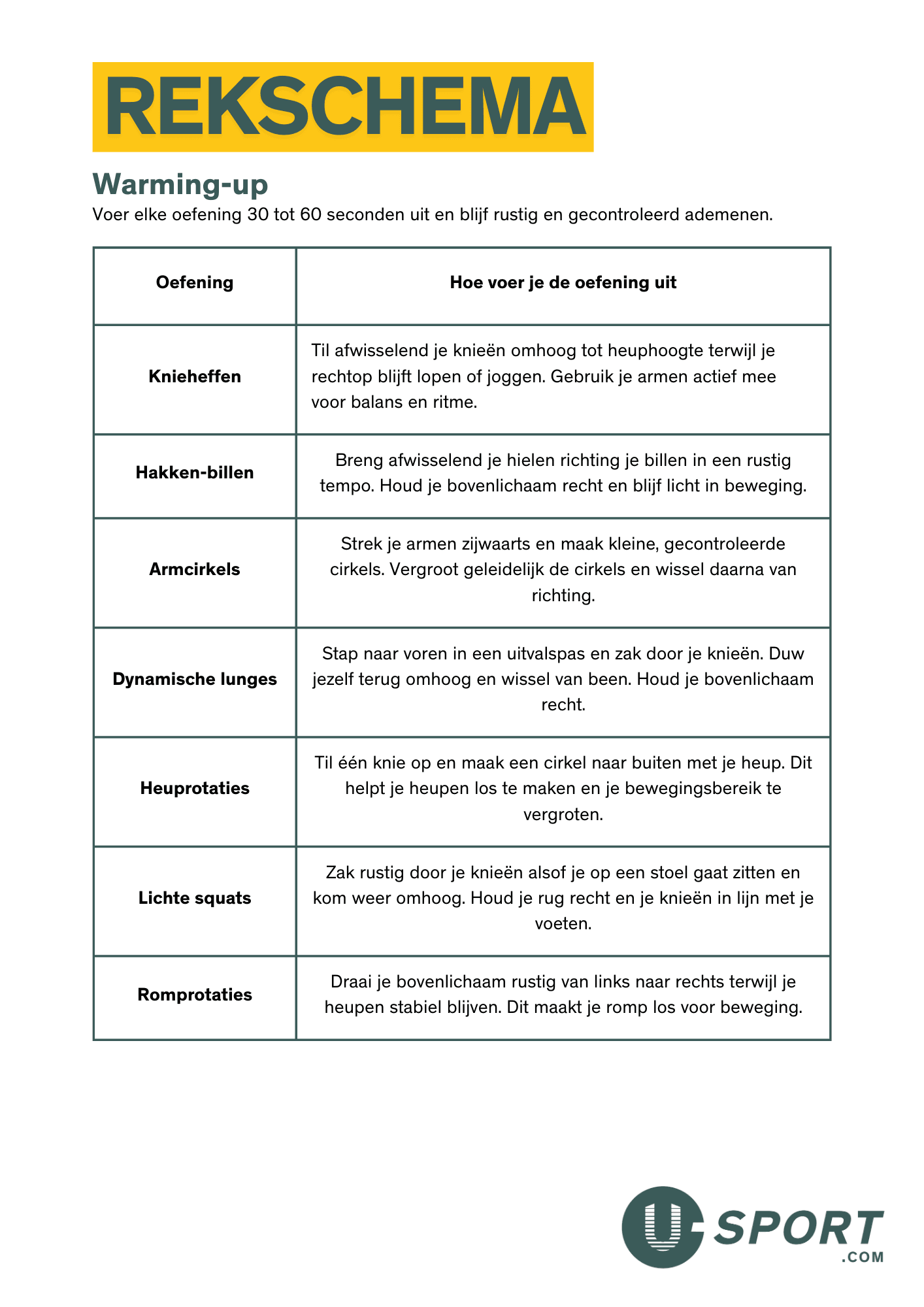 We hebben een praktisch warming-up en cooling-down schema voor je opgesteld waar je geen extra materialen voor nodig hebt. Dit vormt een sterke basis om mee te starten. Afhankelijk van je sport en niveau kun je het schema eenvoudig aanpassen of uitbreiden met oefeningen die beter aansluiten op jouw training en doelen.